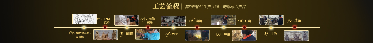制作一件完美的鑄銅雕塑,最重要的步驟就是制作泥塑模型,然后再用工業(yè)硅膠拓印、翻模。所以泥塑的姿態(tài)、神情生動(dòng)與否直接影響最終銅雕塑的品質(zhì)。所以我廠一直對(duì)泥塑模型的制作格外重視。我廠以雕塑為本,以藝術(shù)為根,挾中華文化之傳統(tǒng),偕歐陸藝術(shù)之風(fēng)韻,風(fēng)格獨(dú)特,盡顯淋漓盡致。我們本著大膽創(chuàng)新、勇于突破的精神,以追求卓越為導(dǎo)向,堅(jiān)持寧缺勿濫為原則,并可依照您提供的要求,為您量身設(shè)計(jì)制作。我廠人才濟(jì)濟(jì),有智慧嚴(yán)謹(jǐn)?shù)墓芾戆嘧樱姸嗄贻p充滿激情、充滿創(chuàng)意的專業(yè)設(shè)計(jì)團(tuán)隊(duì)、有專業(yè)技術(shù)精湛的雕塑制作人才和專業(yè)的施工隊(duì)伍。他們不僅具深厚的文化藝術(shù)底蘊(yùn),更汲取當(dāng)代雕塑精華,博采眾家之長(zhǎng),作品既有嚴(yán)肅莊重寫實(shí)題材,也有輕松前衛(wèi)的抽象題材,表現(xiàn)手法上浪漫主義中不乏樸實(shí),現(xiàn)實(shí)主義中蘊(yùn)涵著激情,設(shè)計(jì)理念貫穿古今、融匯中西,深刻詮釋著藝術(shù)的精髓,把古典主義和后現(xiàn)代主義完美的融合,將雕塑藝術(shù)演繹為力的凝聚、美的體現(xiàn),讓人們感受到的不僅是一種藝術(shù)的浪漫與優(yōu)雅、粗獷與悲壯、更是豐富的優(yōu)秀藝術(shù)寶藏和文化傳統(tǒng),讓您在藝術(shù)與文化中穿流,在時(shí)空中飄蕩,使靈魂在藝術(shù)的海洋洗禮。 MORE+